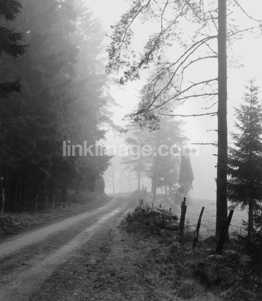- Dirt road. forest road in the fog. småland