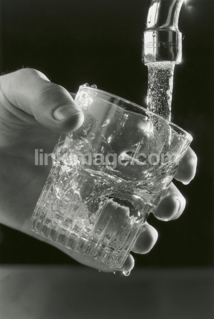 - Hand with a glass water. faucet.
