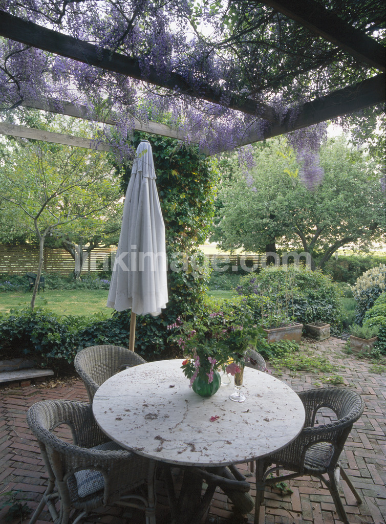 - parasol, wicker chairs, table, brick, garden, patio furniture, patio