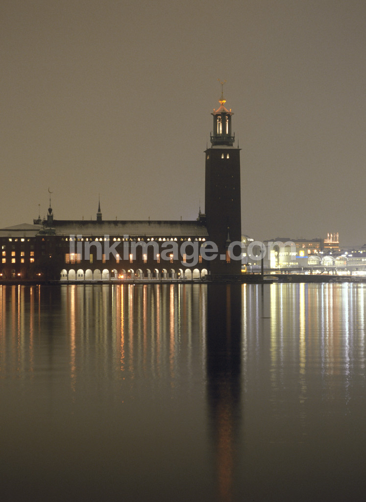 - night, reflection, still, architecture, water, sea, tower, statshus, policy