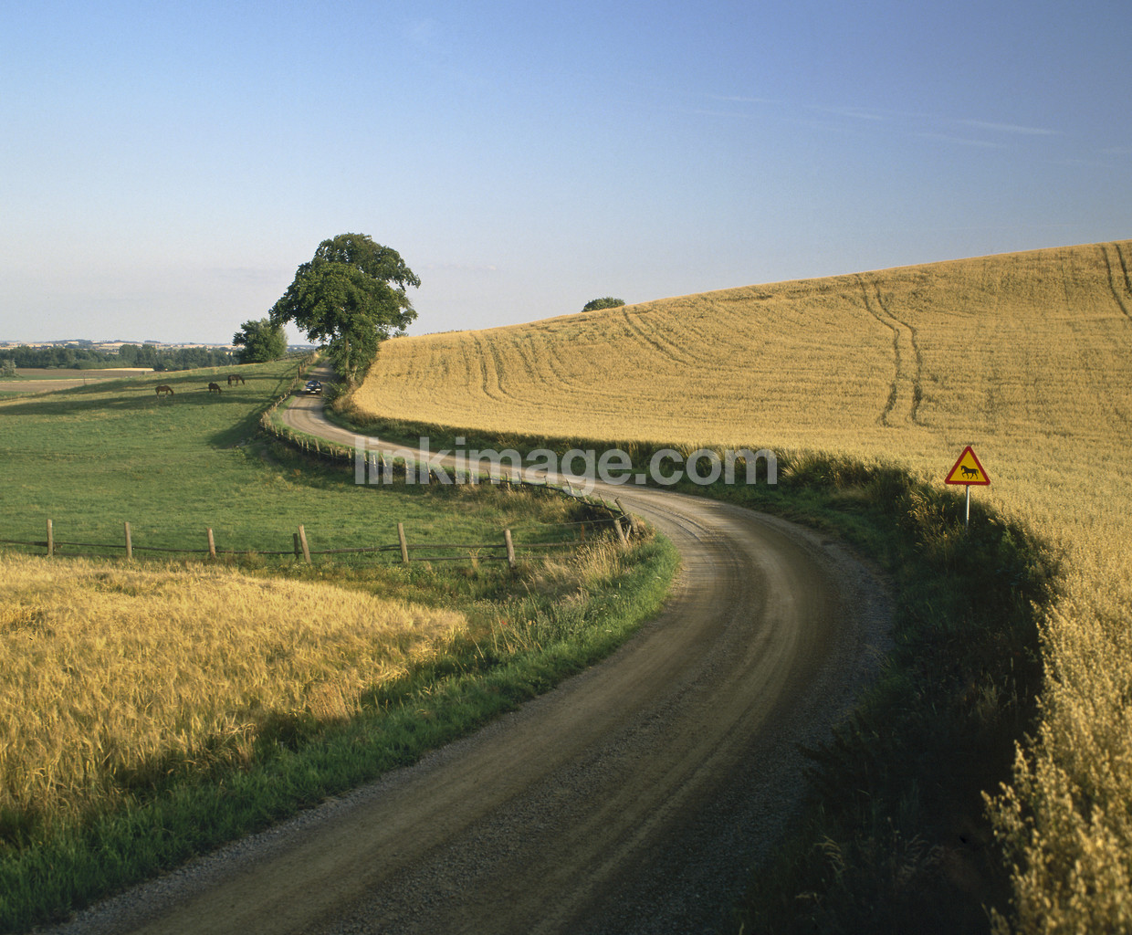 - road, curve, spot, agricultural, fence, horizon, cropland, field