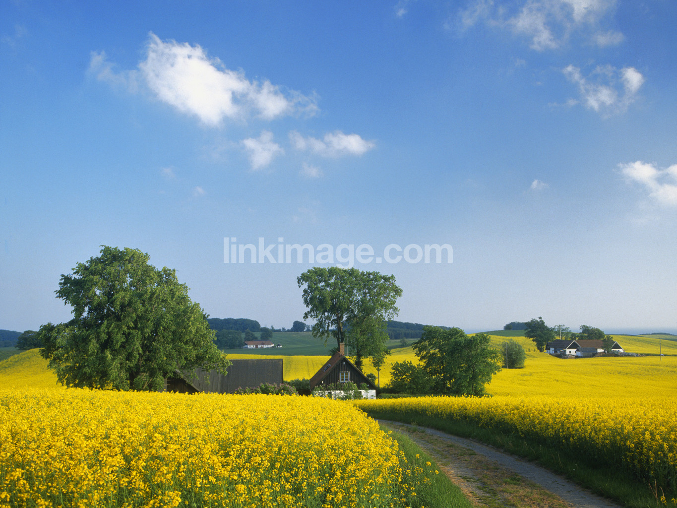 - agricultural, agriculture, meadow, summer, sky, tree, rapsfält, rapeseed, house, home, housing, yard, road, gravel road