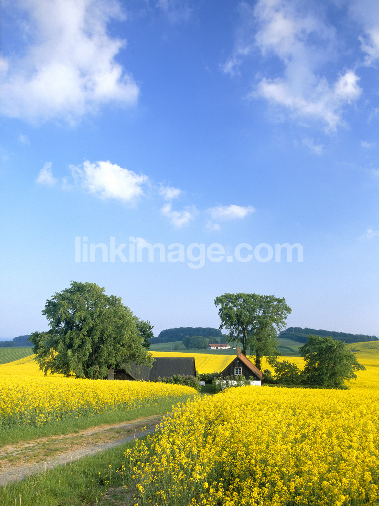 - agricultural, agriculture, meadow, summer, sky, tree, rapsfält, rapeseed, house, housing, yard, road, gravel road