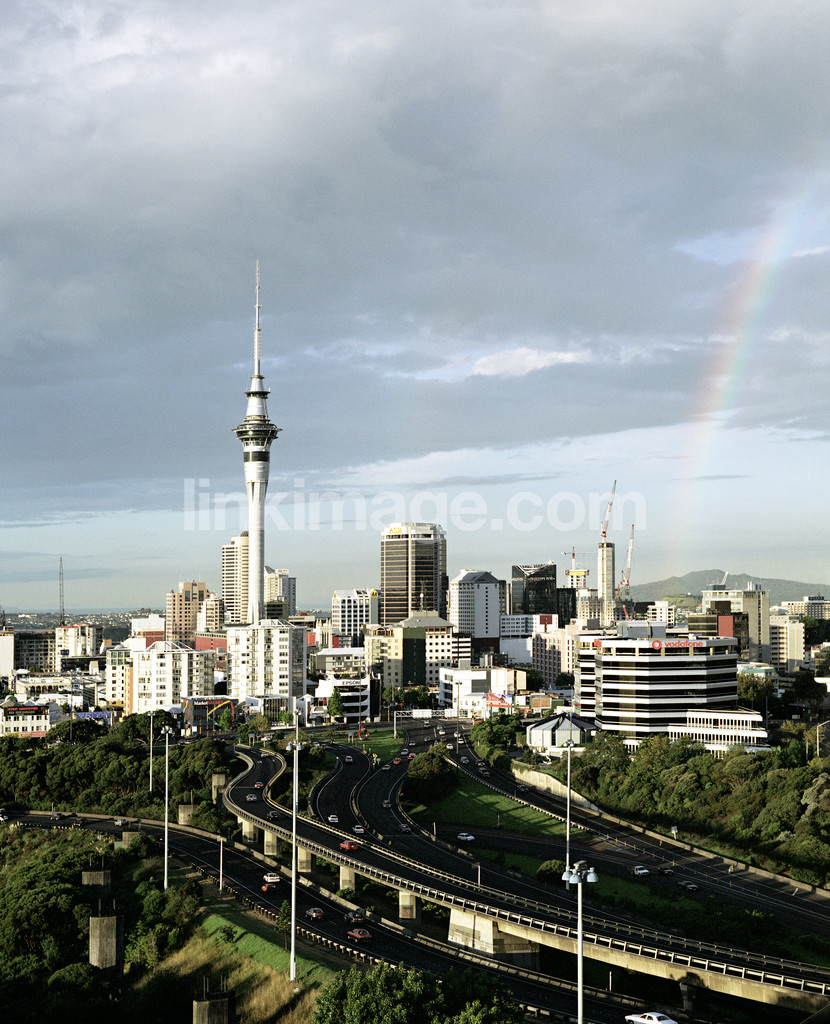 city, city, road, traffic, metropolitan, sky, rain, rainbow, cloud, summer, park and ride, house, housing, office, sl1781