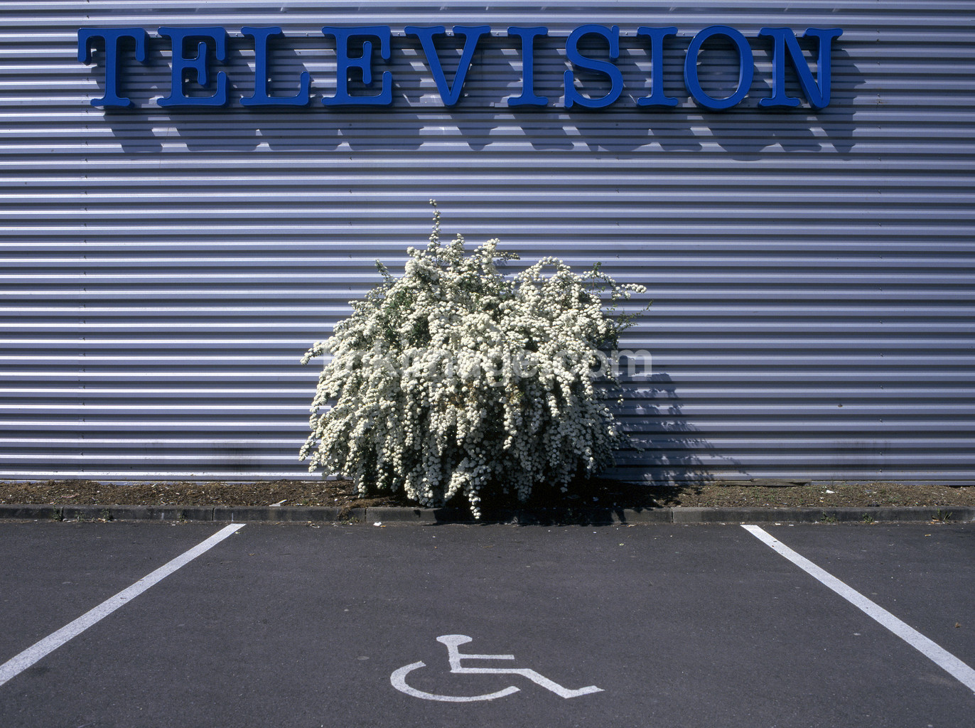- people with disabilities, parking, tv, wall, bush, asphalt, wheelchair