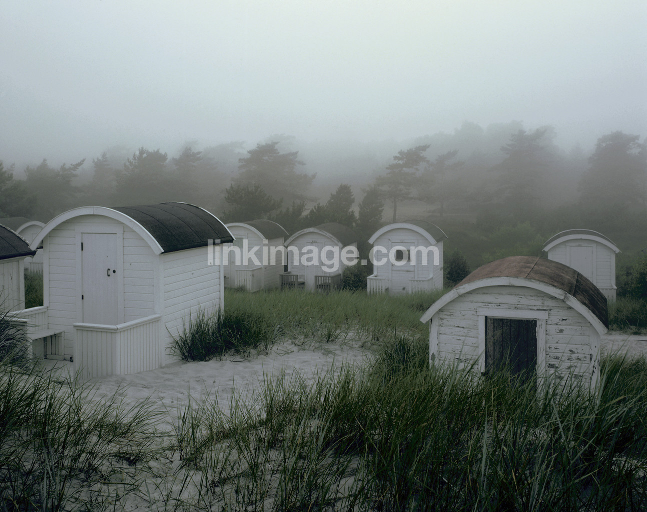 - cabanas, shore, fog, dawn