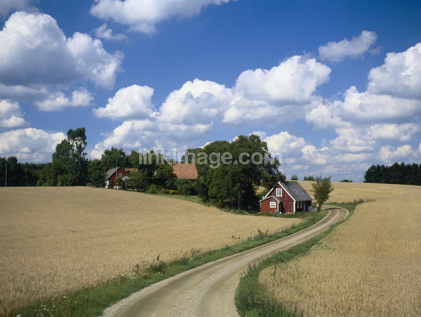 - road, cottage, field, summer, house, gravel road, rural, cloud