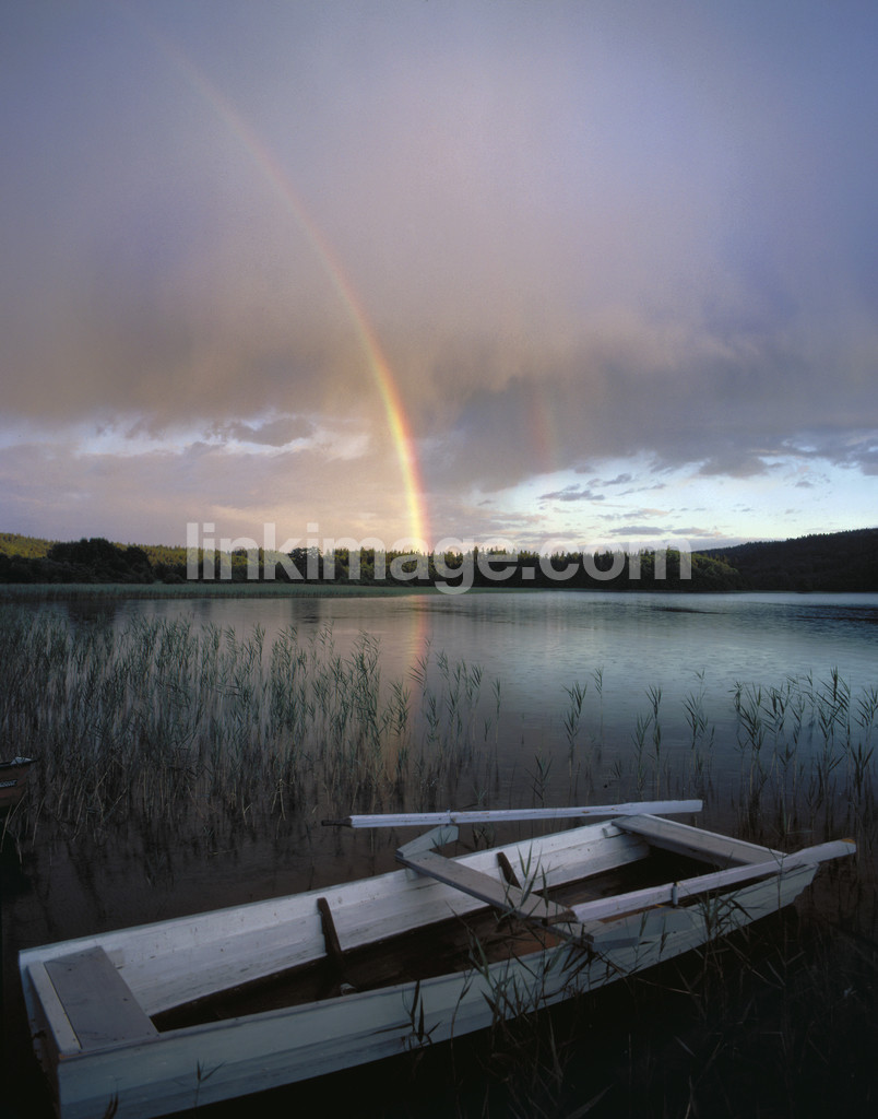 nature, lake, reed, echo, rowboat, rainbow, cloud, evening, boat, swedish