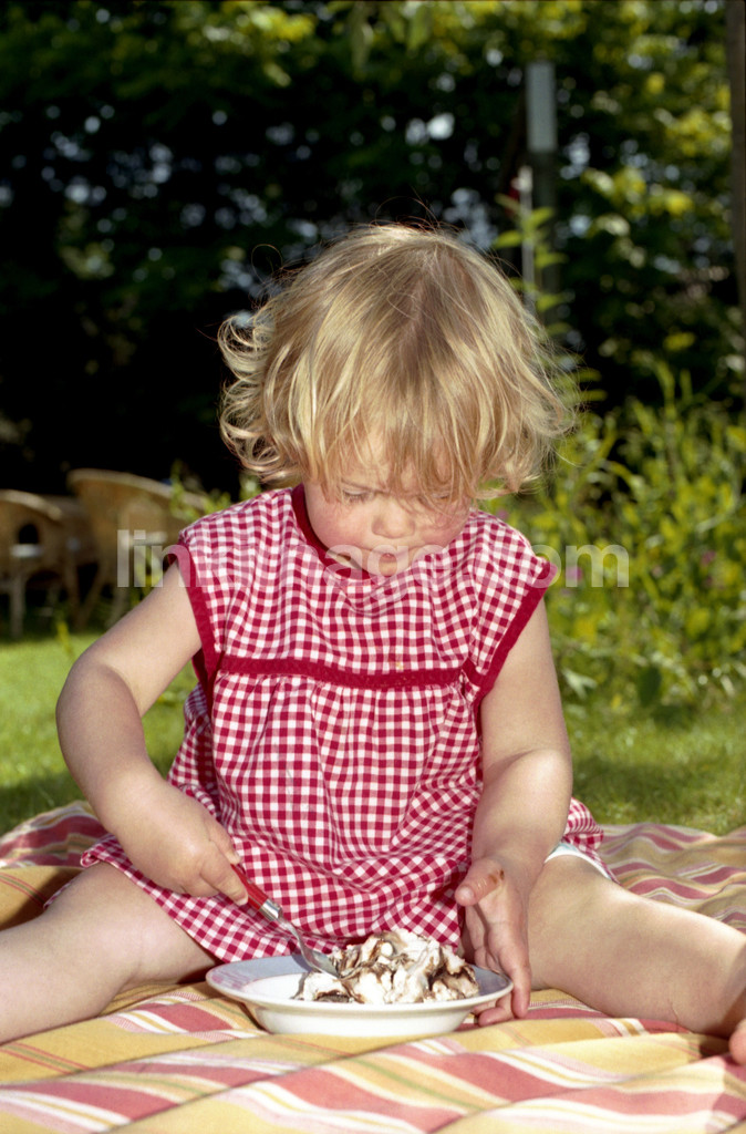 - children, ice cream, out, else, summer, plate, spoon, apron, girl, eat, picnic