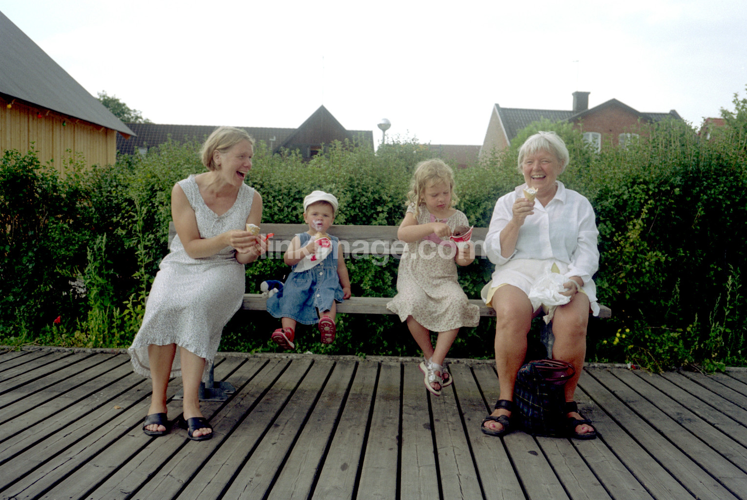 man, leisure, holiday, children, adults, ice cream, bench, mother, grandma, family, siblings, girls, women