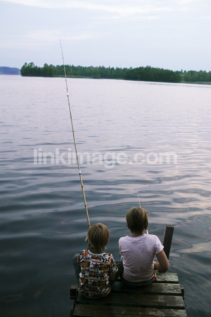 - lake, water, summer, evening, children, quiet, dusk, meta, brothers, friends, two, fish, bridge, stillness