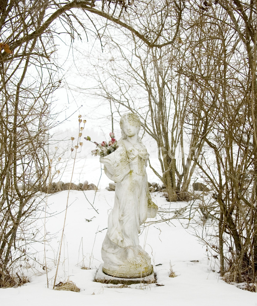 statue, female, winter, snow, garden