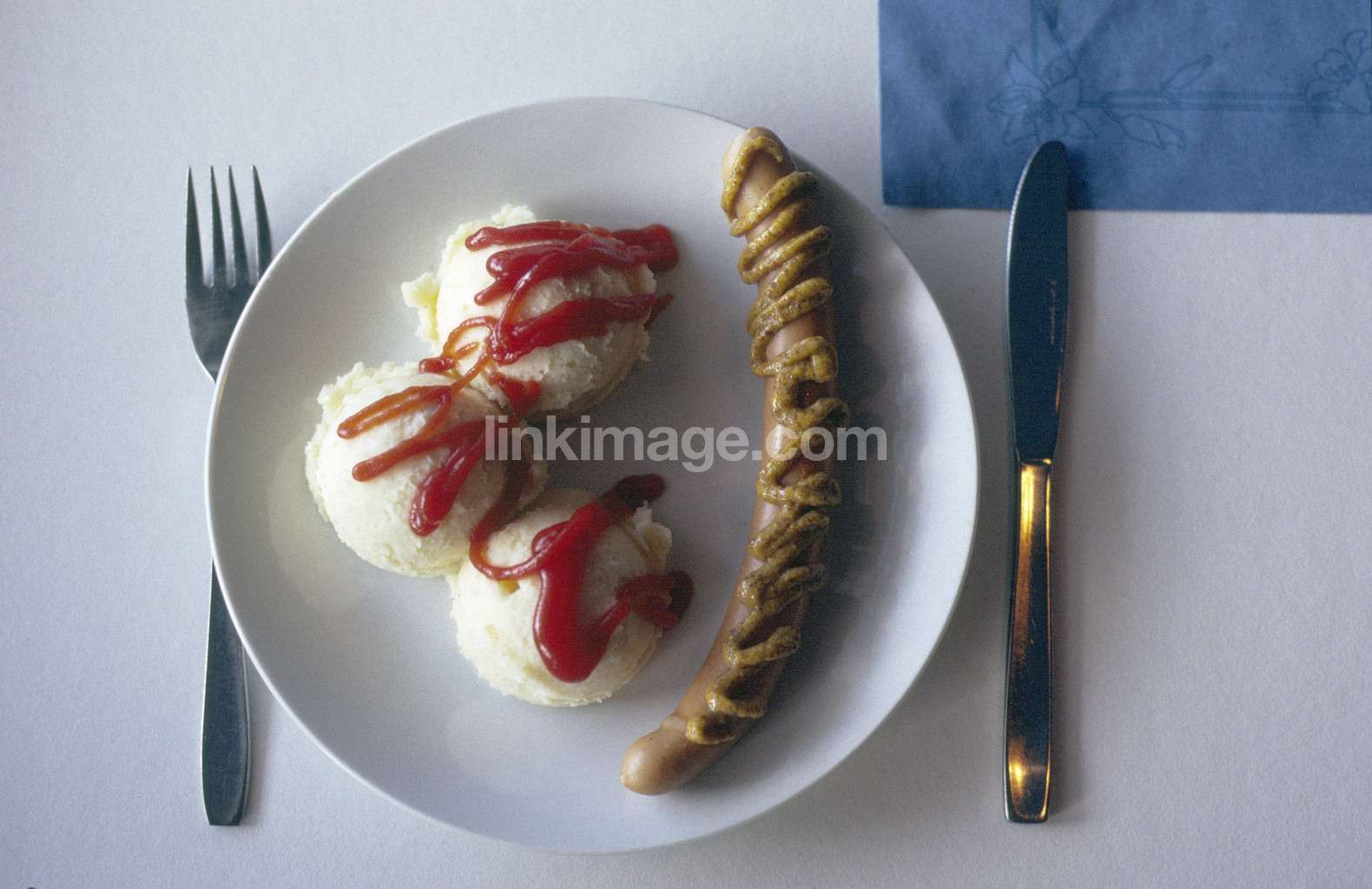 - food, plate, sausage, mashed potatoes, ketchup, knife, fork, mustard, fast, circle, cutlery