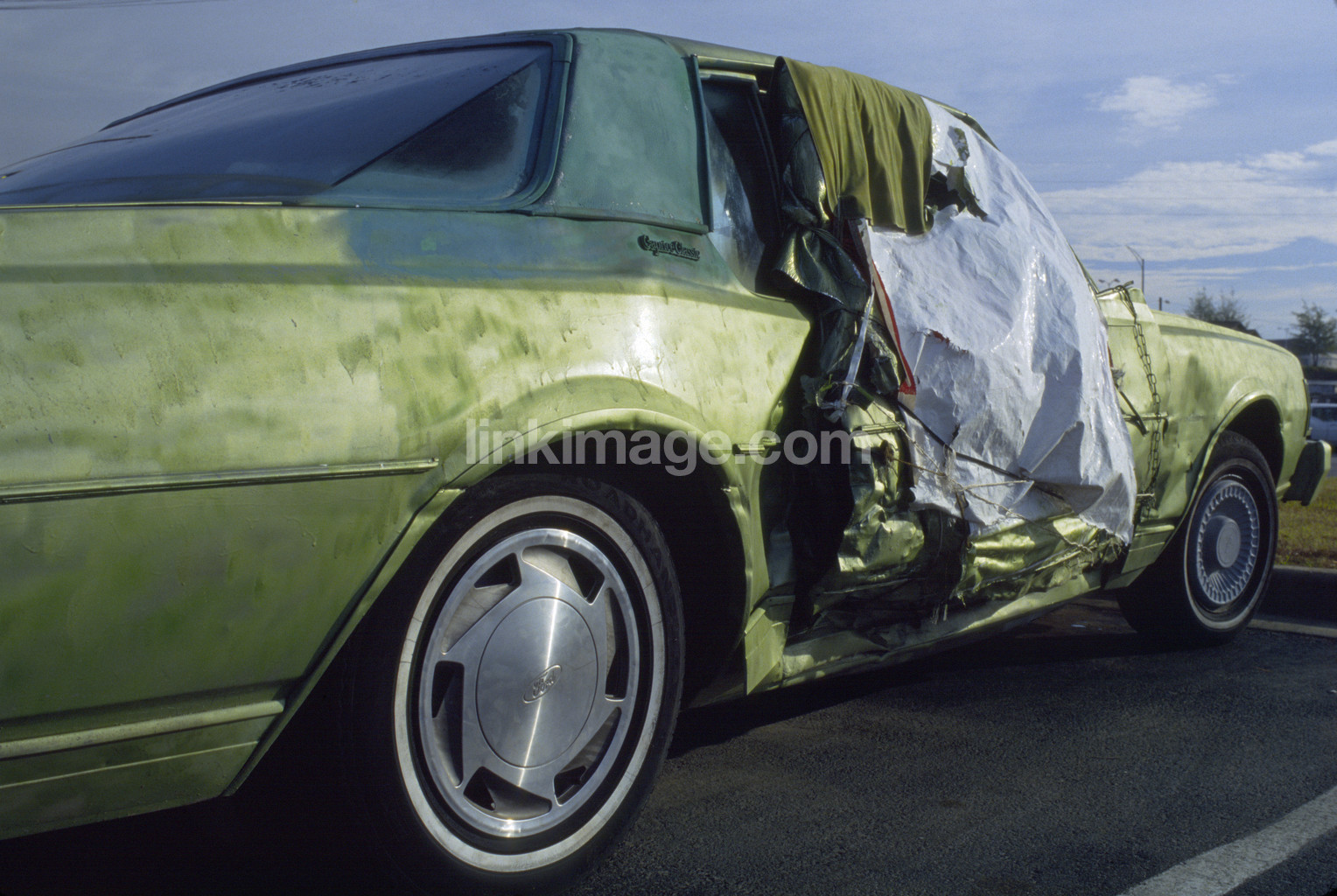Crashed Car. USA Id. 22309 Photographer Gerry Johansson Headline Crashed car. usa Keywords green, wheel, cooked, makeshift, plastic, broken, elv, damaged Model release Model released. Available for commercial usage Color mode Color Image Size Width 5321 px Height 3567 px add to lightbox buy download low res watermarked