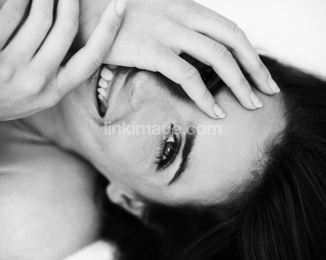 - nude, female, portrait, photo model, happy, hands, or, laugh, hide, to, face, hand