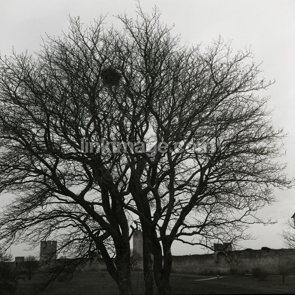- tree, magpie's nest, nest, city, curtain wall, tree crown, branches, wall
