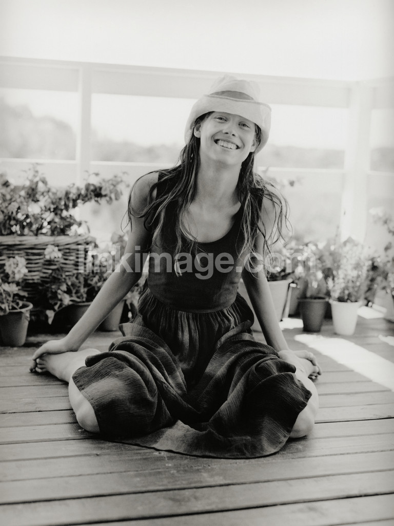 - female, girl, summer, laughter, fashion, unscheduled, holiday, le, happy, hat, balcony, sitting, or, smile