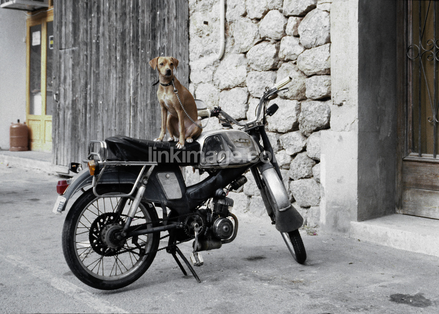 - city, animals, dog, moped, motorbike, building, wait, crave, sitting, waiting
