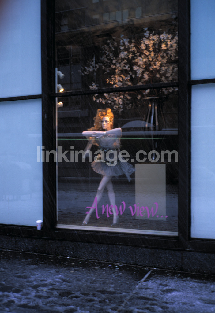 - storefront, mannequin, trapped, alone, abandoned, store, business, rain, snow, flowers, locked, fashion, female, prison, hairstyle