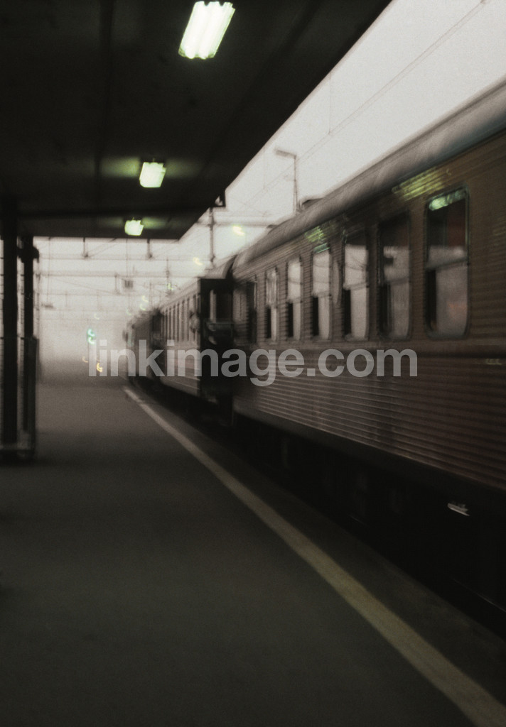 platform, train, railway wagons, fog, haze, dusk, trip, holiday, commute, stop, transport