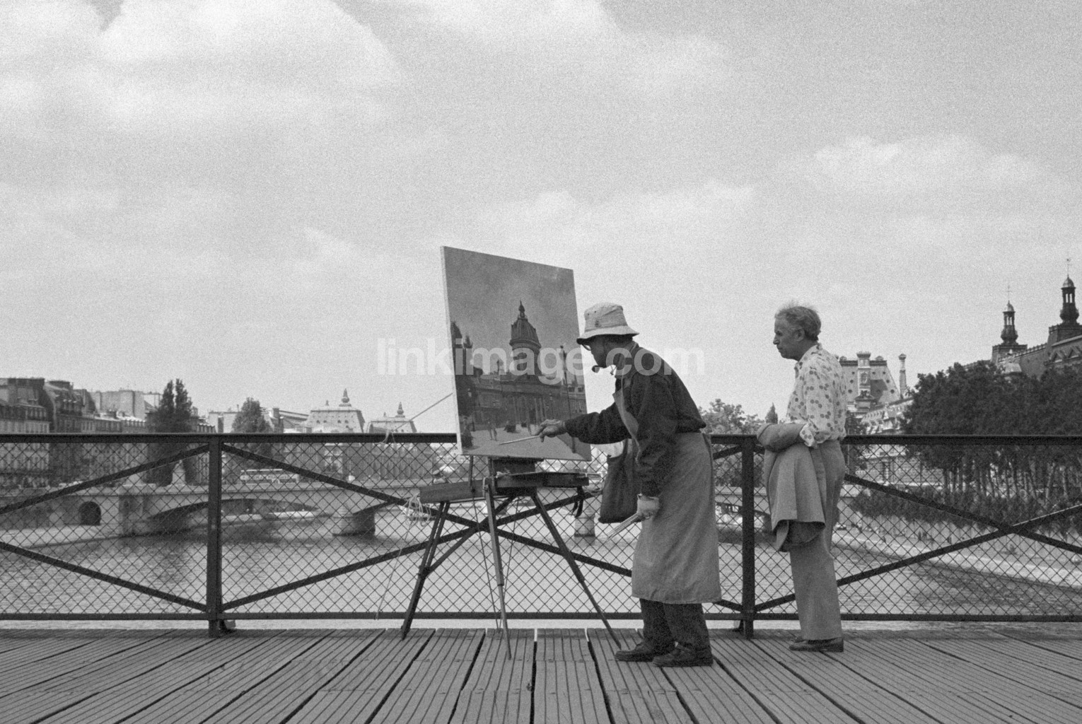 - human, male, artist, painter, paris, tourism, bridge, railing, fence, city, watch, consider, river, work, profession, hot, summer, plate, easel
