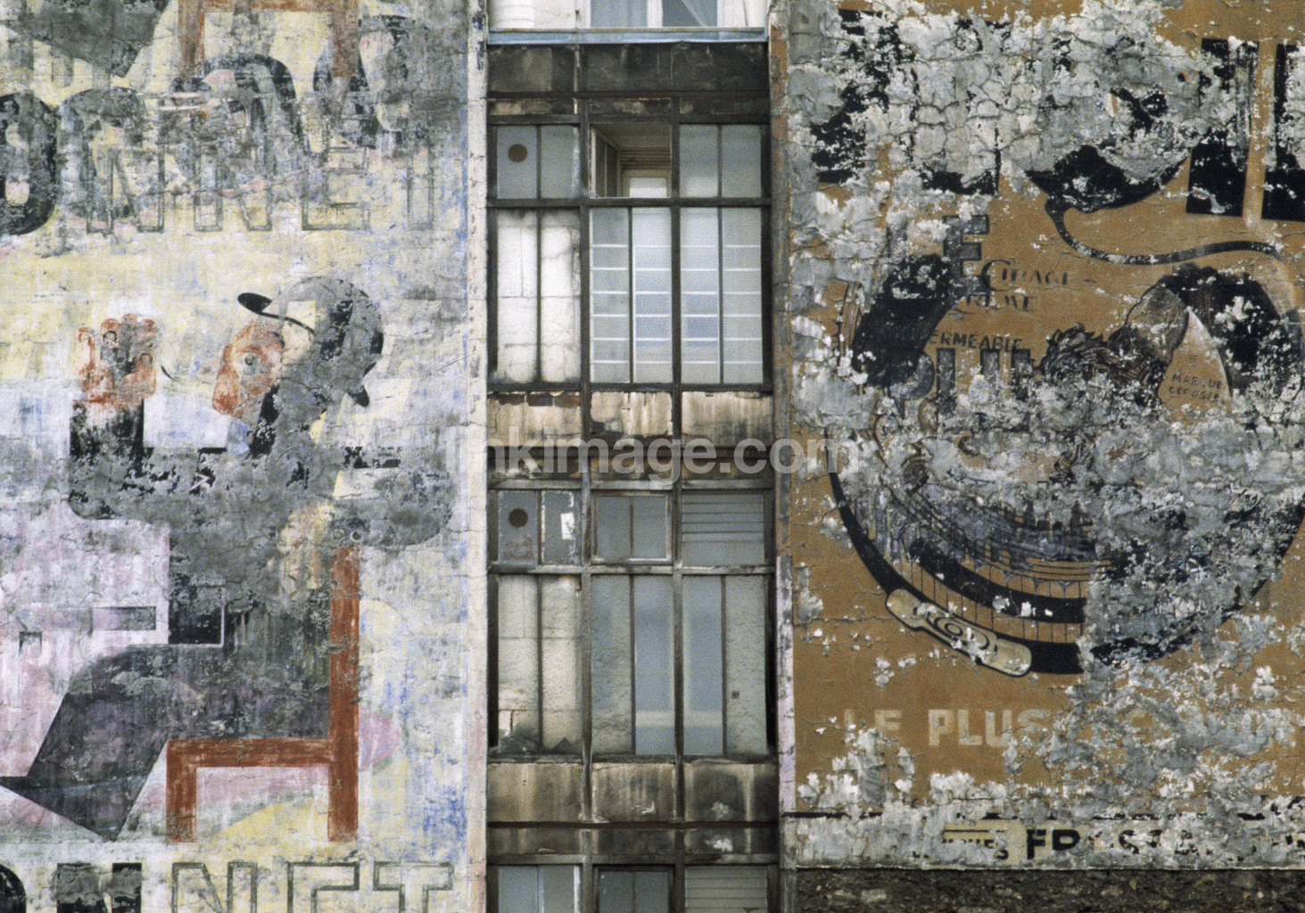 - mural, advertising, sign, text, words, letters, male, sit, worn, old, craquelure, form, design, window, house, building, wall