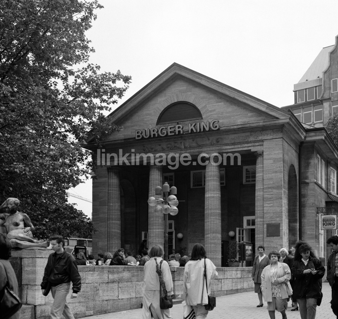 - city, building, people, statue, columns, walk, stone, restaurant, eat, hamburger, fast, culture, temple, health, park