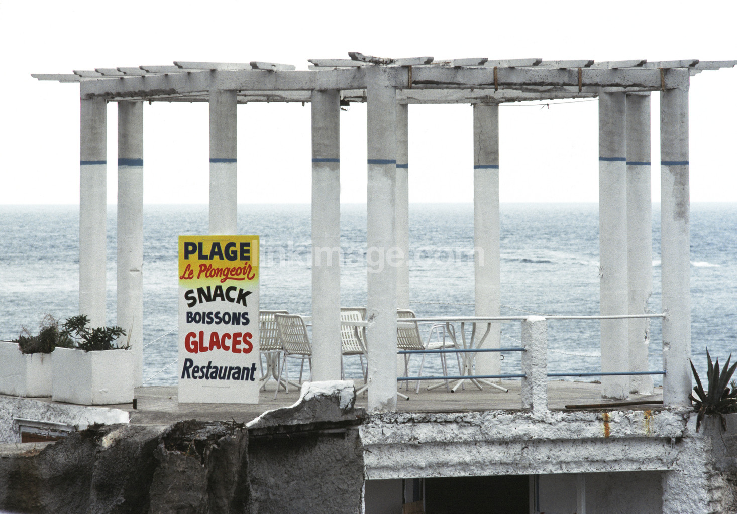 - restaurant, bar, eatery, cafe, furniture, cafe chairs, building, sea, summer, broken, sign