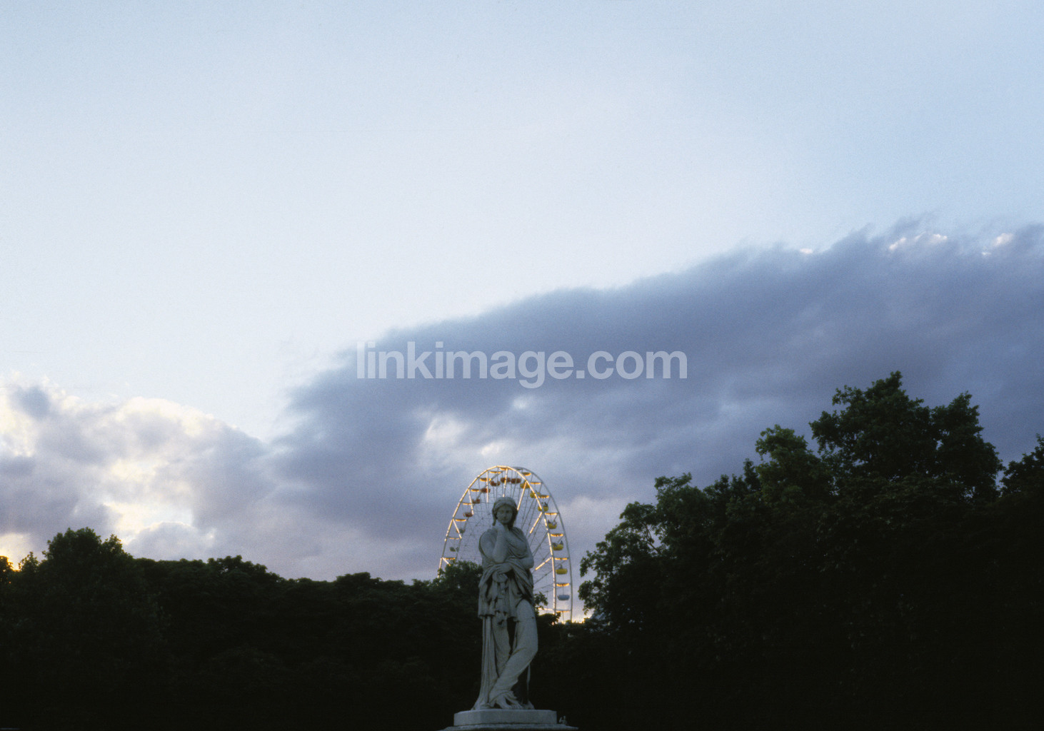 - statue, male, ferris wheel, fairgrounds, amusement park, carousel, pleasure, park, tree, dusk, sky, ride
