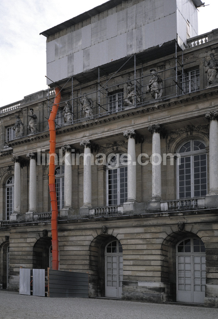 - building, city, palace, architecture, improvement, orange, red, statues, window, column, scaffold, gray, louvre, construction, tube, tear