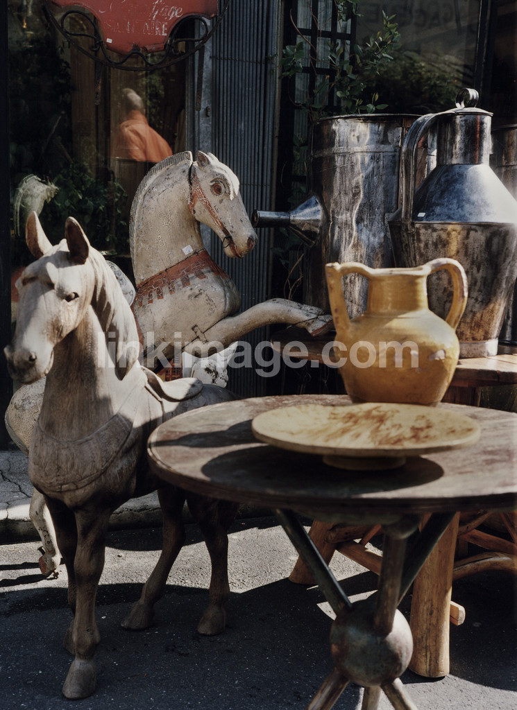market, antique, auction, horses, wooden horses, old, worn, jars, vessel, trade, act, shop, sell, table