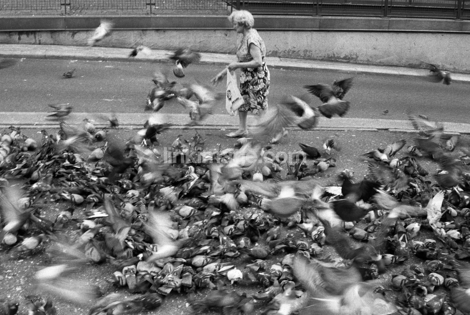 street, human, female, pensioner, feed, animals, birds, pigeons, fly, messy, pavement, city, black and white