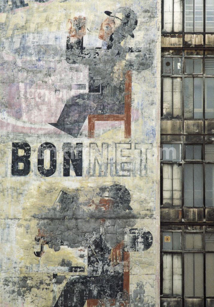 - mural, advertising, sign, male, sit, house, building, wall, worn, old, craquelure, window, text, words, letters, form, design, headwrap