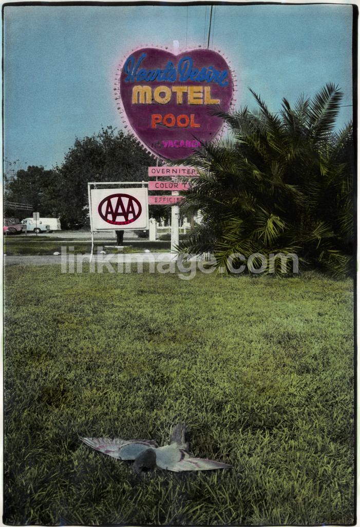 - death, bird, heart, grass, motel, hotel, pool, desire, overnight, sleep, rest, mysterious, colored, pink, holiday
