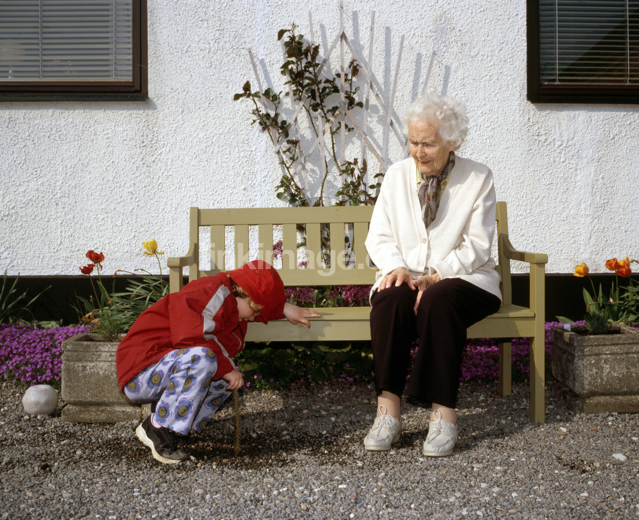 - older, children, generations, family, grandma, grandmother, bench, spring, grandchildren, two