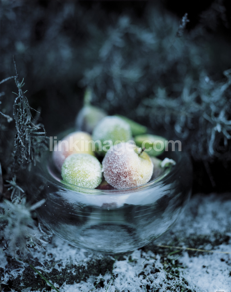 apple, winter, snow, ice, frost, july, feast, spruce, glass, bowl, fruits, cold, call
