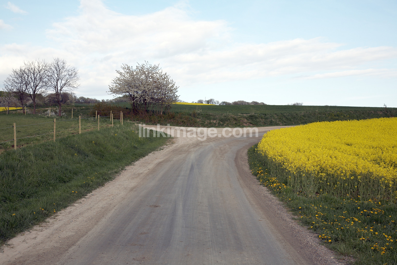 road, rapeseed, pasture, field, turn, gravel road, sky
