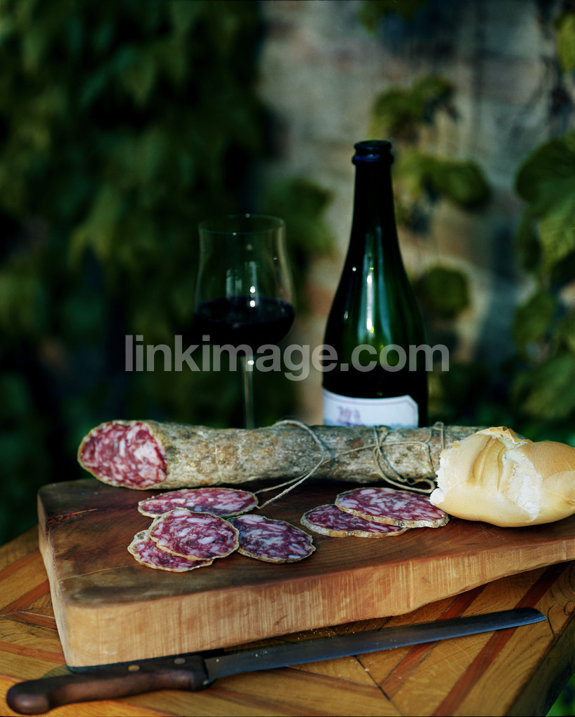 - wine, bread, salami, sausage, knife, cutting board, glass, table, bottle, rs, sliced
