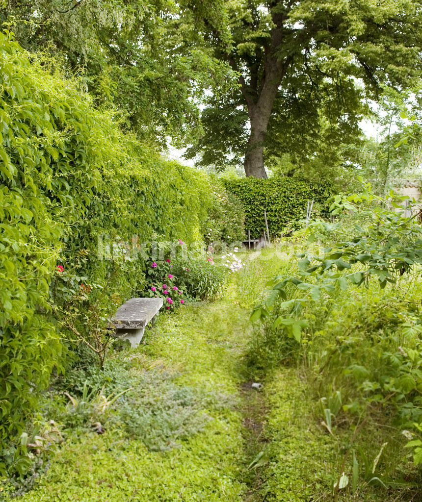 garden, greenery, green, ivy, summer, romance, stone bench, bench, hedge, bushes, plants, tree, overgrown