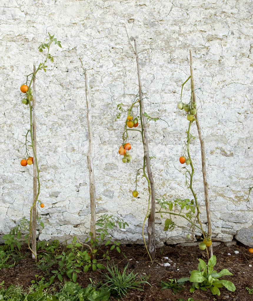 - tomatoes, culture, garden, vegetable garden, fruits, stone wall, stakes, stone, wall, land, leaf