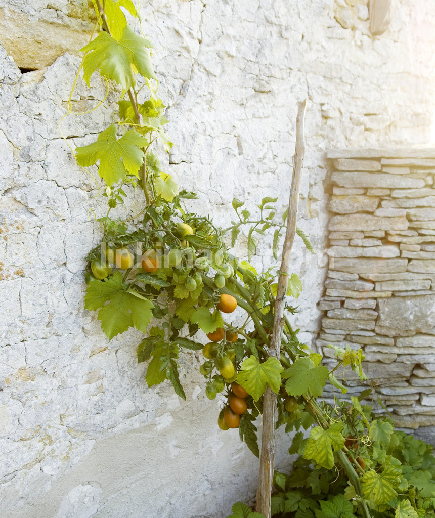 - tomatoes, culture, garden, stone wall, fruits, wall, stone, stick