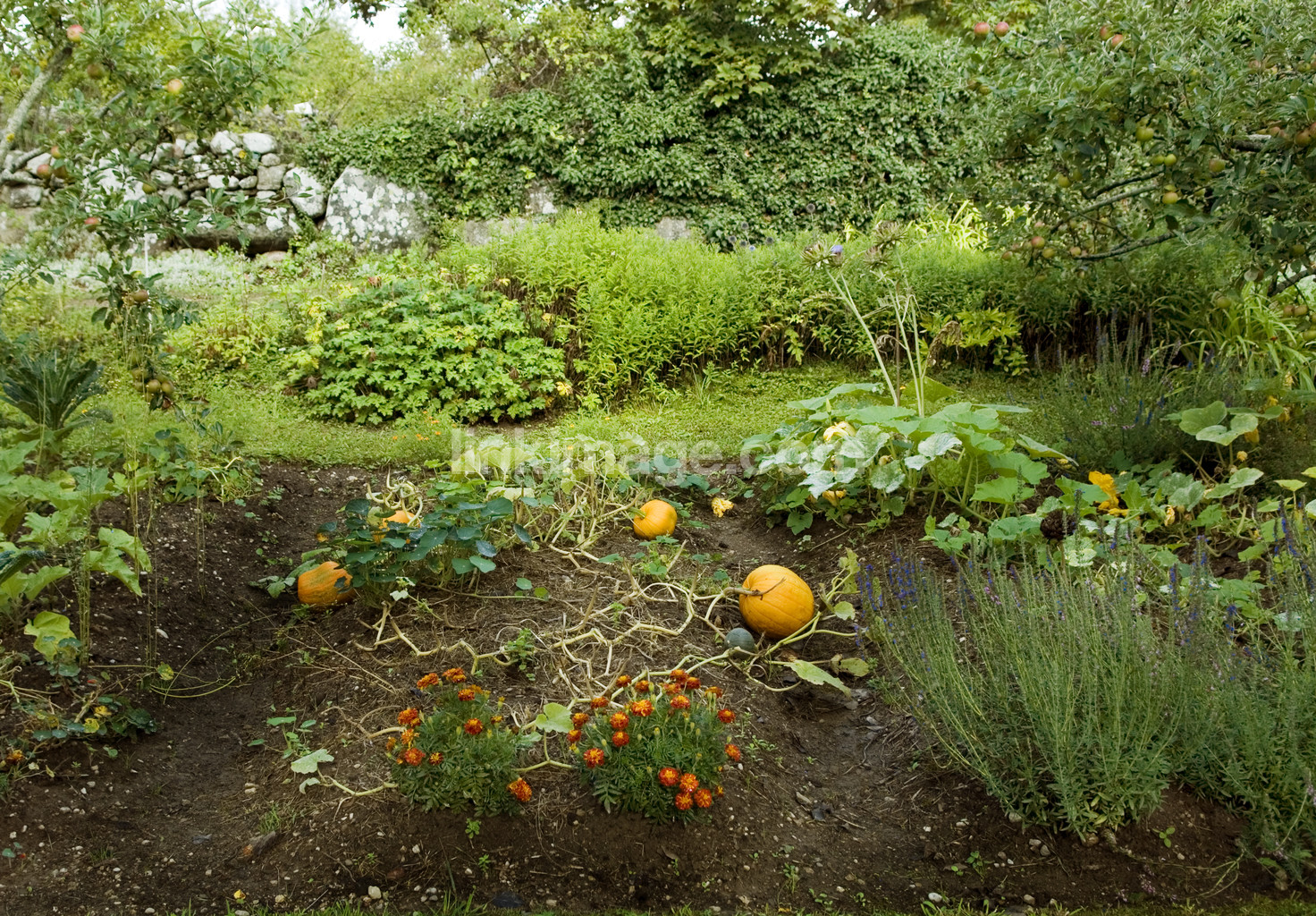 - vegetable garden, garden, culture, pumpkins, tagetes, fall, harvest, soil, vegetables, flowers, plants, green, bushes