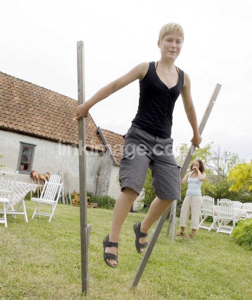 - girl, female, play, stilts, wobbly, joy, garden, summer, youth, house, country place, patio, toy, girls