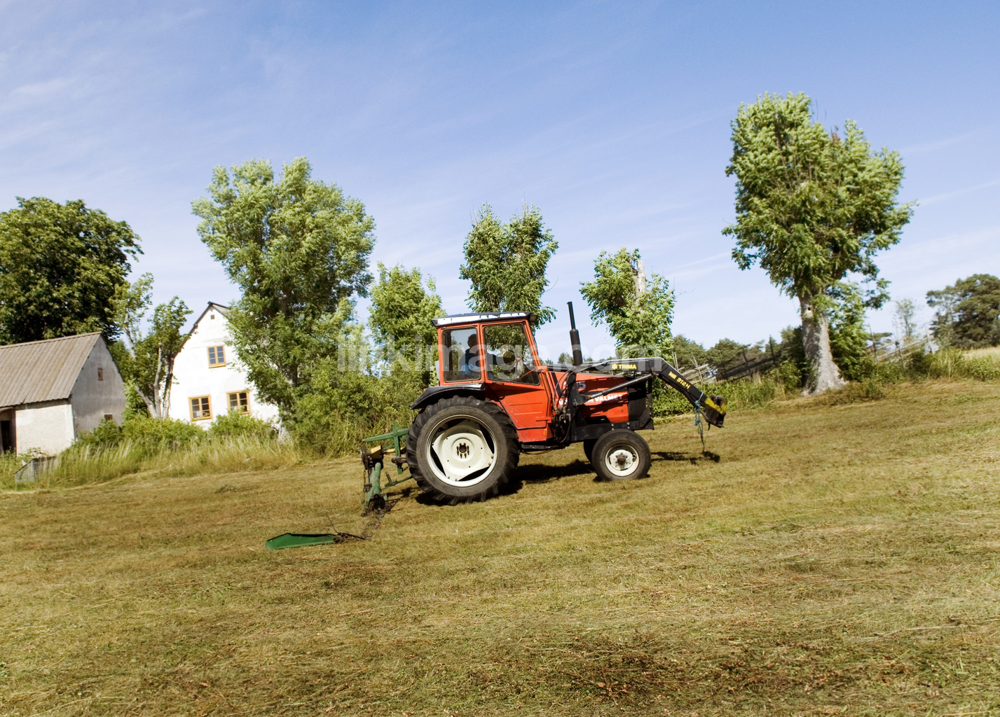 garden, backhoe, grass, hay, meadow, midsummer, summer, yard, house, tree, lawnmowers