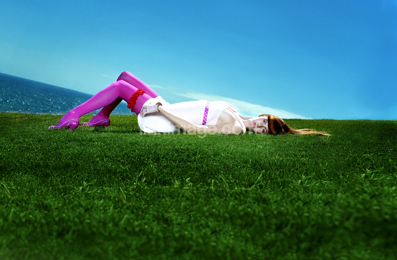 - female, girl, grass, summer, pink, fashion, sky, clothes, is, lawn, water, horizon