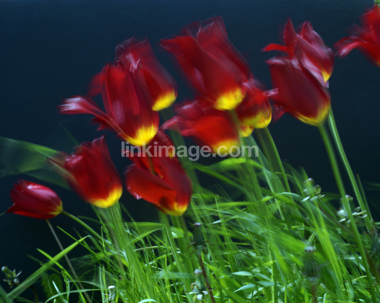 tulips, red, yellow, movement, wind, summer, flowers, flower, leaf, stalk, grass, night, fuzzy, blurred