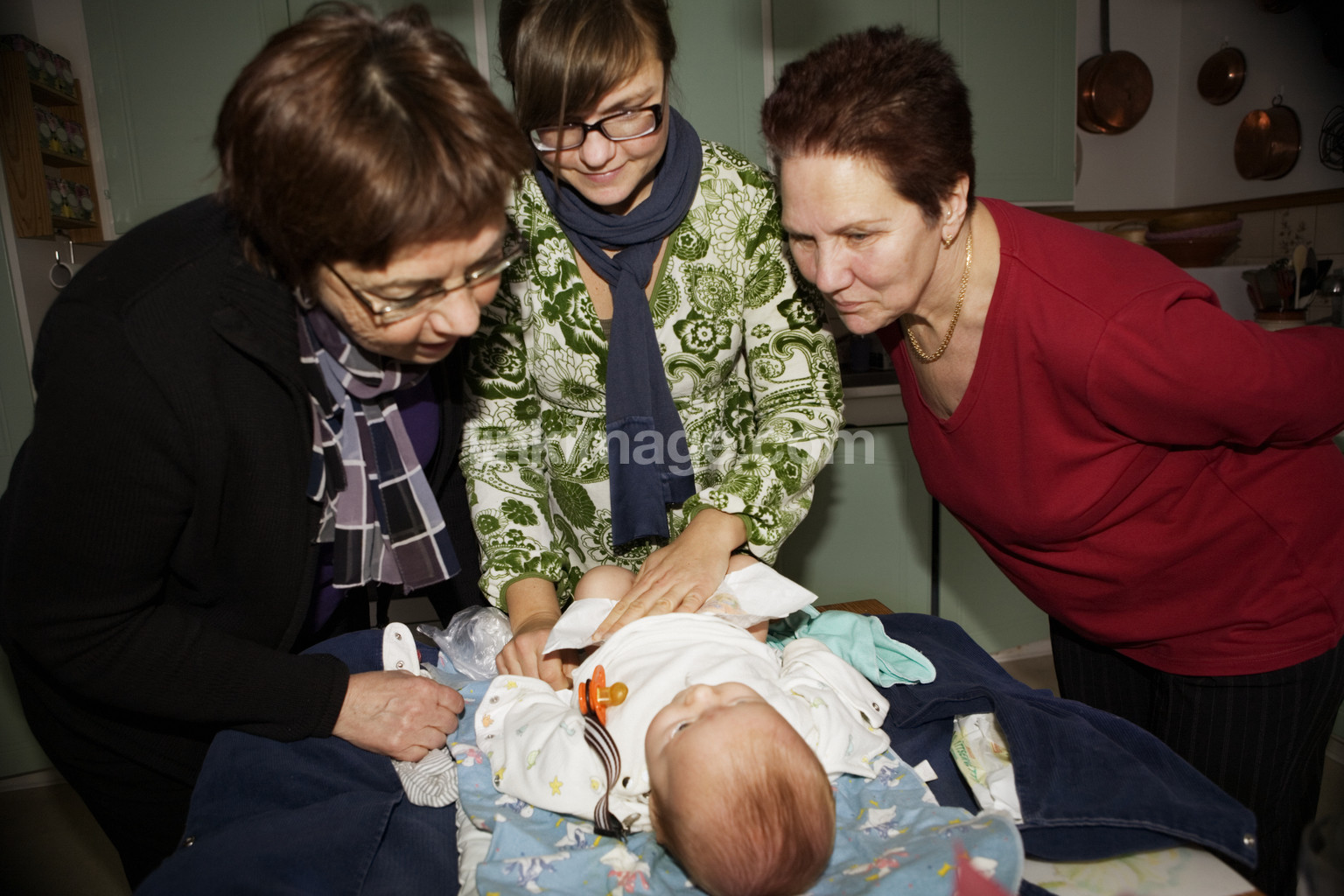 - several, generations, together, older, mother, moms, baby, grandma, grandmother, family, diapers, kitchen