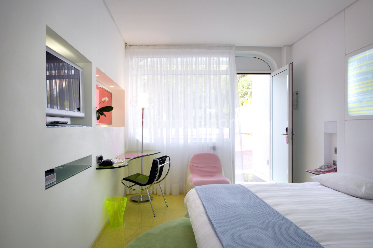 - rates, bedroom, bed, chairs, tv, apparatus, balcony, door entry, table, trash, mat, neon colors, interior, sl3097