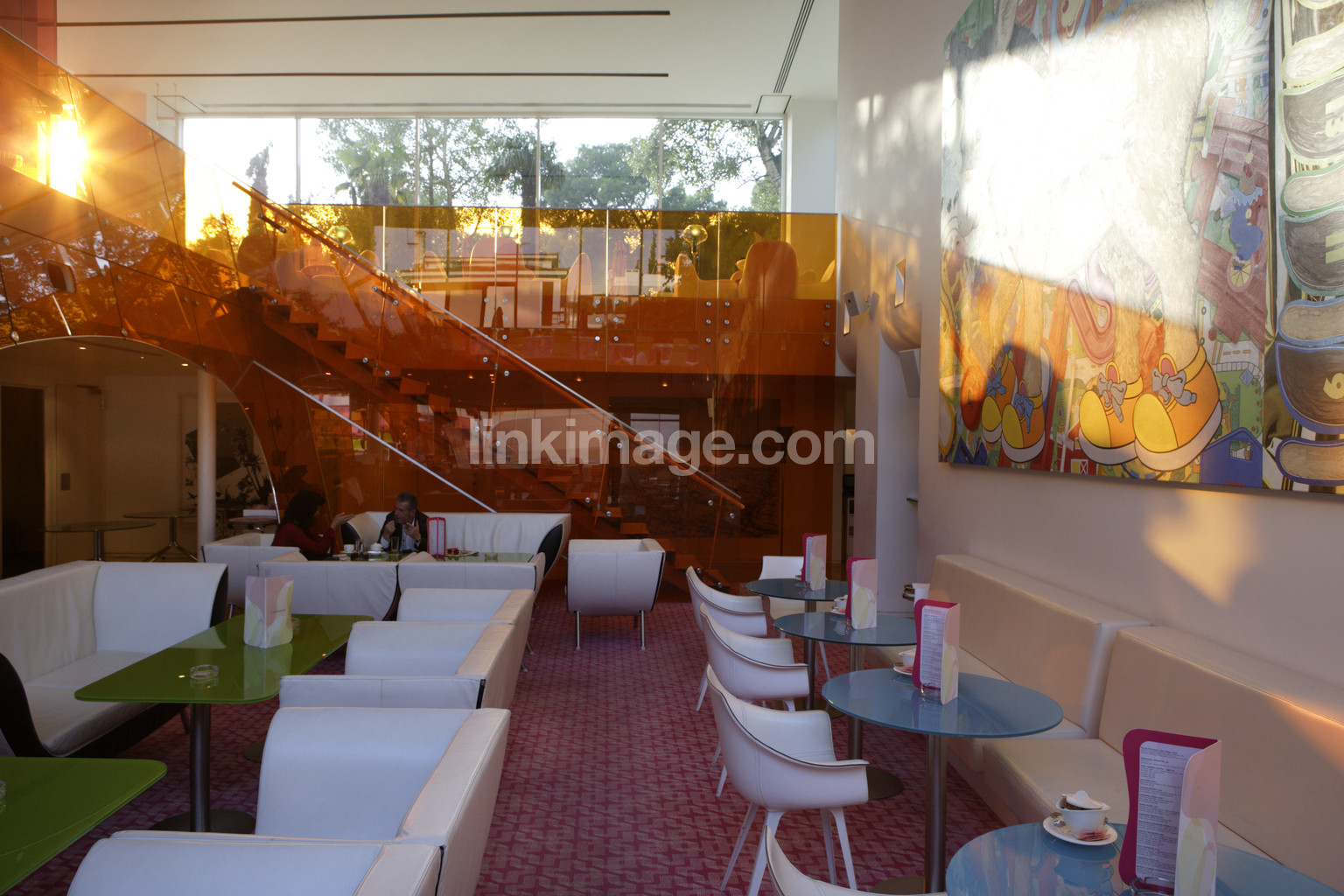 - hotel, design, staircase, table, chairs, restaurant, bar, interior, sun, dusk, neon colors, sl3105