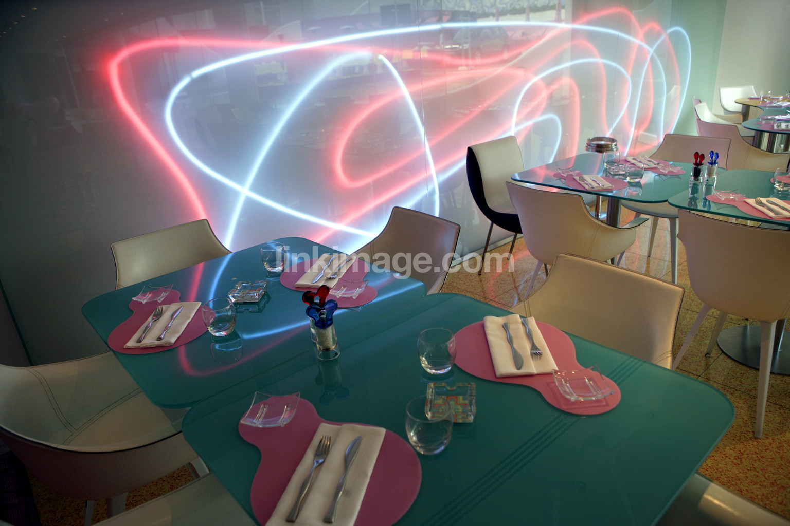 - hotel, design, table, chairs, restaurant, eat, food, groaning, serving, service, fluorescent, neon colors, glass, cutlery, sl3106